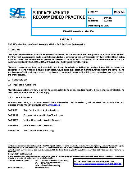 This SAE Recommended Practice establishes procedure for the issuance and assignment of a World Manufacturer Identifier (WMI) on a uniform basis to vehicle manufacturers who may desire to incorporate it in their Vehicle Identification Numbers (VIN). This recommended practice is intended to be used in conjunction with the recommendations for VIN systems described in SAE J853, J187, J272, and other SAE reports for VIN systems.
