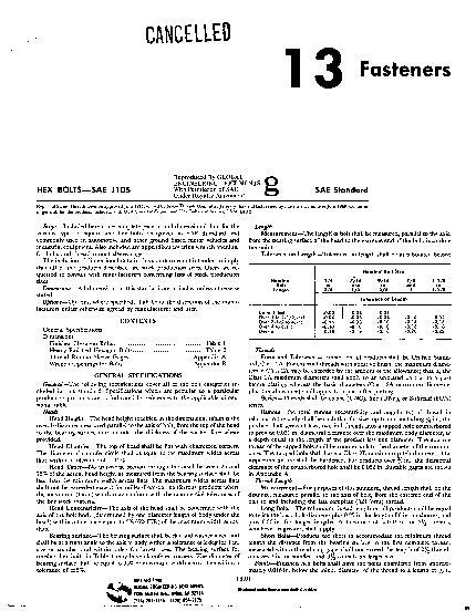Included herein are complete general and dimensional data for the various types of square and hex bolts recognized as SAE Standard and commonly used in automotive and other ground based motor vehicles and industrial equipment. Also included are appendixes covering wrench openings for bolts and thread runout sleeve gages. The inclusion of dimensional data in this standard is not intended to imply that all of the products described are stock production sizes. Users are requested to consult with manufacturers concerning lists of stock production sizes.