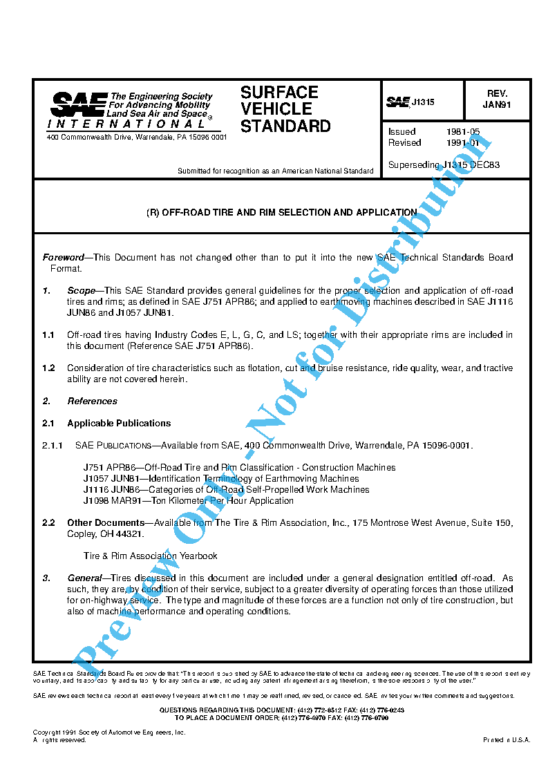 This SAE Standard provides general guidelines for the proper selection and application of off-road tires and rims; as defined in SAE J751 APR86; and applied to earthmoving machines described in SAE J1116 JUN86 and J1057 JUN81.