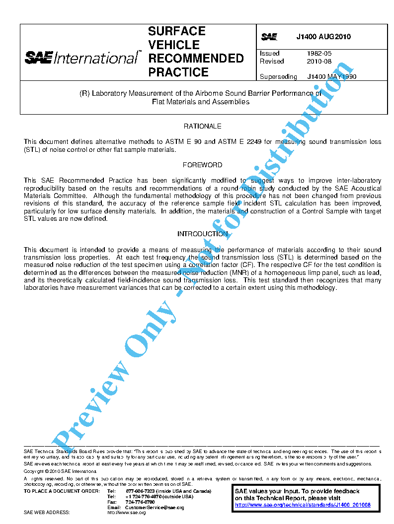 This SAE Recommended Practice presents a test procedure for determining the airborne sound insulation performance of materials and composite layers of materials commonly found in mobility, industrial and commercial products under conditions of representative size and sound incidence so as to allow better correlation with in-use sound insulator performance. The frequency range of interest is typically 100 to 8000 Hz 1/3 octave-band center frequencies.