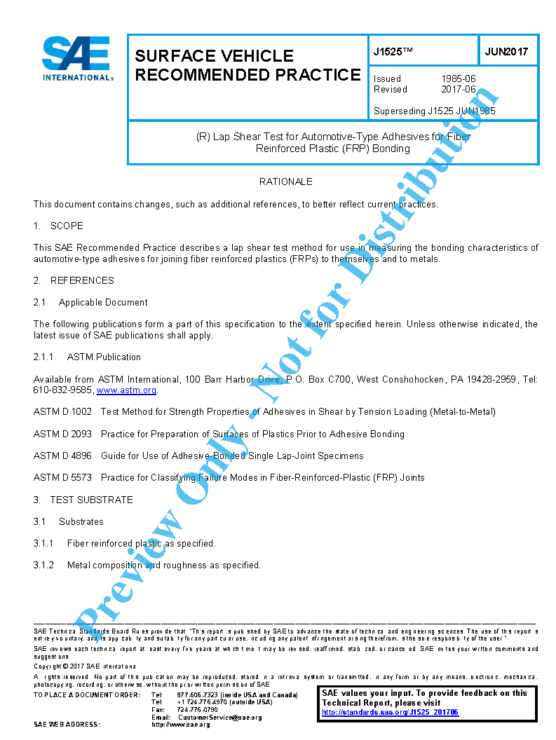 This SAE Recommended Practice describes a lap shear test method for use in measuring the bonding characteristics of automotive-type adhesives for joining fiber reinforced plastics (FRPs) to themselves and to metals.