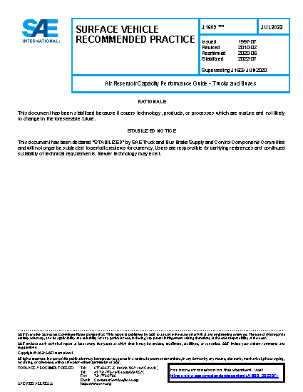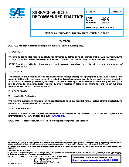 This SAE Recommended Practice establishes performance guidelines of the air reservoir systems used on trucks, towing trucks, truck-tractors, trailers, and converter dollies with GVWRs over 10 000 lb designed to be used on the highway.