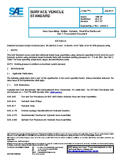 This SAE Standard covers steel wire reinforced rubber hose assemblies using connectors specified in SAE J516 for use in hydraulic systems using petroleum based hydraulic fluids with maximum working pressures of 1.7 to 42 MPa. See Part 2, Table 7 for hose operating temperature ranges and identification codes.