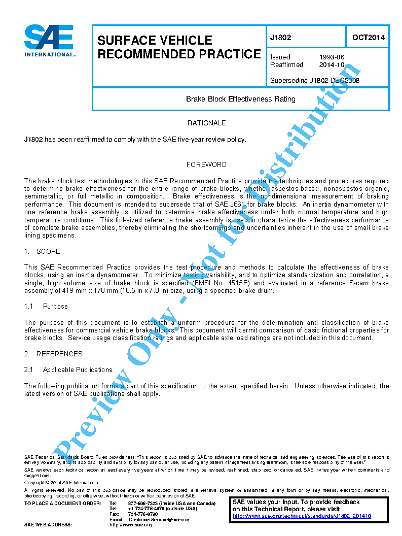 This SAE Recommended Practice provides the test procedure and methods to calculate the effectiveness of brake blocks, using an inertia dynamometer. To minimize testing variability, and to optimize standardization and correlation, a single, high volume size of brake block is specified (FMSI No. 4515E) and evaluated in a reference S-cam brake assembly of 419 mm x 178 mm (16.5 in x 7.0 in) size, using a specified brake drum.