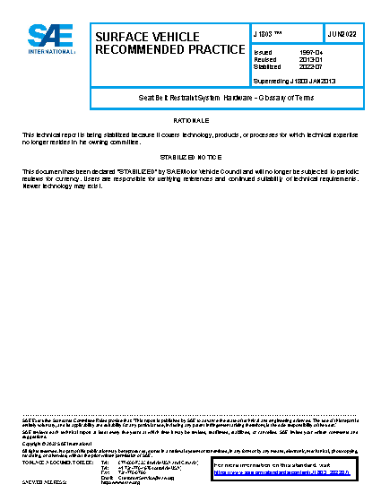 This SAE Recommended Practice provides a Glossary of Terms commonly used to describe Seat Belt Restraint Systems Hardware and their function. These terms are currently defined in various SAE Recommended Practices but are sometimes inconsistent. It is intended for this document to supersede the definitions found in separate SAE Recommended Practices.