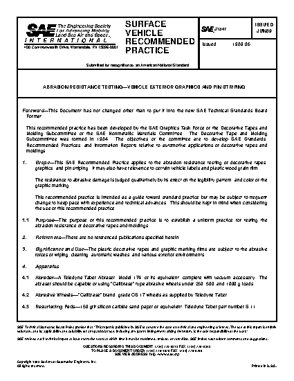 This SAE Recommended Practice applies to the abrasion resistance testing of decorative tapes, graphics, and pin striping. It may also have relevance to certain vehicle labels and plastic wood grain film.