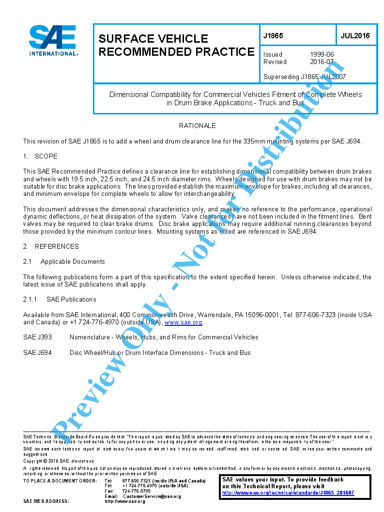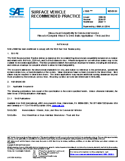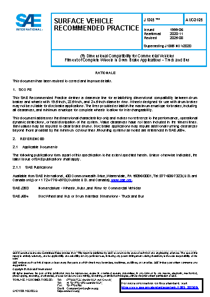 This SAE Recommended Practice defines a clearance line for establishing dimensional compatibility between drum brakes and wheels with 19.5 inch, 22.5 inch, and 24.5 inch diameter rims. Wheels designed for use with drum brakes may not be suitable for disc brake applications. The lines provided establish the maximum envelope for brakes, including all clearances, and minimum envelope for complete wheels to allow for interchangeability.