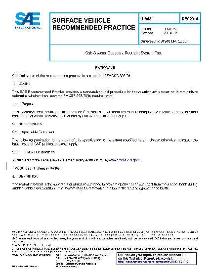 This SAE Recommended Practice provides a standardized test procedure for heavy-duty truck sleeper berth restraints to determine whether they meet the FMCSR 393.76(h) requirements.