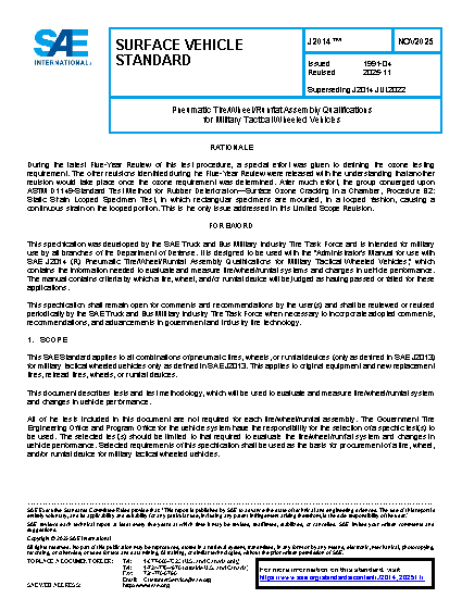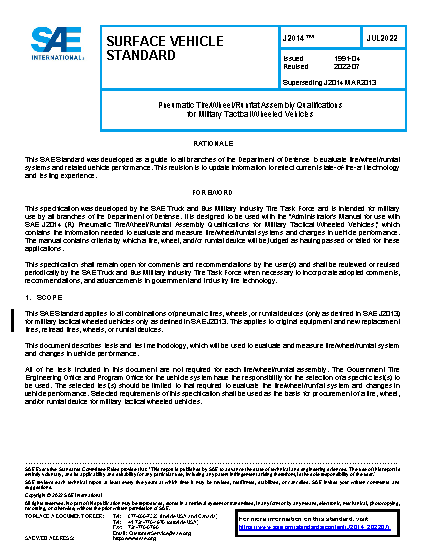 This SAE Standard applies to all combinations of pneumatic tires, wheels, or runflat devices for military tactical wheeled vehicles only as defined in SAE J2013. This applies to original equipment and new replacement tires, retread tires, wheels or runflat devices.