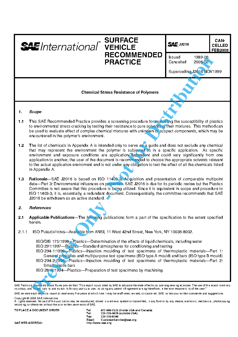 This SAE Recommended Practice provides a screening procedure for evaluating the susceptibility of plastics to environmental stress cracking by testing their resistance to pure solvents or their mixtures. This method can be used to evaluate effect of complex chemical mixtures with unknown or suspect components, which may be encountered in the polymer's environment.