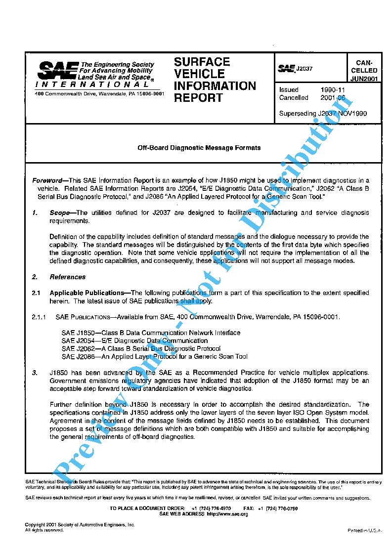 The utilities defined for J2037 are designed to facilitate manufacturing and service diagnosis requirements. Definition of the capability includes definition of standard messages and the dialogue necessary to provide the capability. The standard messages will be distinguished by the contents of the first data byte which specifies the diagnostic operation. Note that some vehicle applications will not require the implementation of all the defined diagnostic capabilities, and consequently, these applications will not support all message modes.