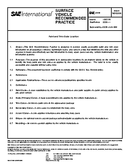 This SAE Recommended Practice is designed to provide readily accessible paint and trim code information on all passenger vehicles, lightweight trucks, and vans in a way that minimizes the time and effort required to locate and effectively use that information for body repair, parts ordering, vehicle maintenance, and information systems.