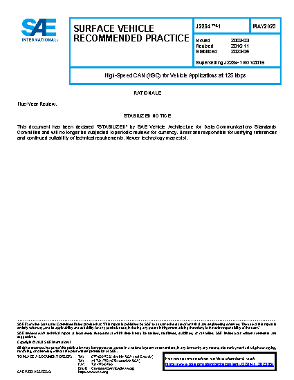This SAE Recommended Practice will define the Physical Layer and portions of the Data Link Layer of the Open Systems Interconnection model (ISO 7498) for a 125 kbps High Speed CAN (HSC) protocol implementation. Both ECU and media design requirements for networks will be specified. Requirements will primarily address the CAN physical layer implementation.
