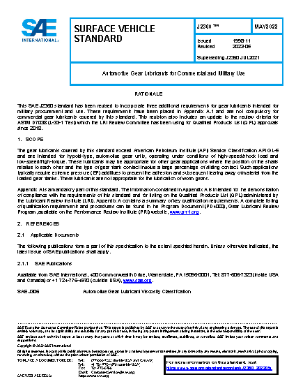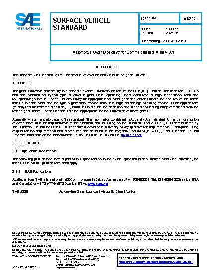 The gear lubricants covered by this standard exceed American Petroleum Institute (API) Service Classification API GL-5 and are intended for hypoid-type, automotive gear units, operating under conditions of high-speed/shock load and low-speed/high-torque. These lubricants may be appropriate for other gear applications where the position of the shafts relative to each other and the type of gear flank contact involve a large percentage of sliding contact. Such applications typically require extreme pressure (EP) additives to prevent the adhesion and subsequent tearing away of material from the loaded gear flanks. These lubricants are not appropriate for the lubrication of worm gears.