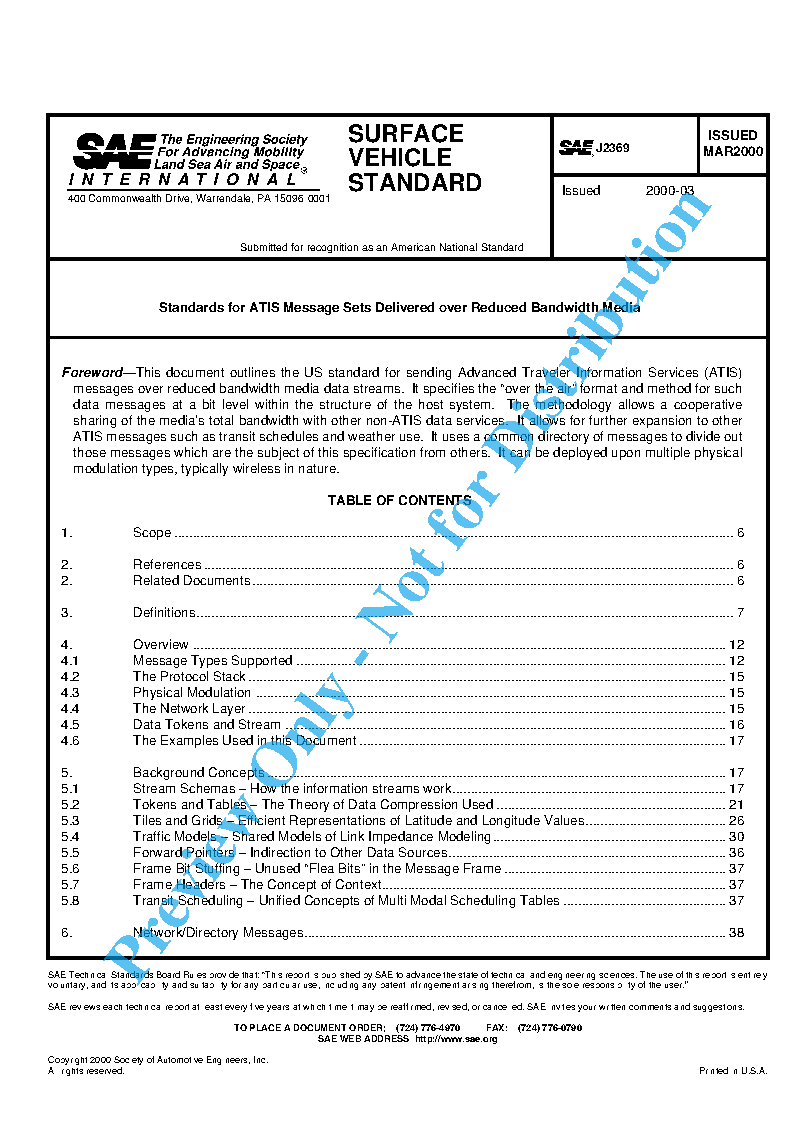 This SAE Standard outlines the US standard for sending Advanced Traveler Information Services (ATIS) messages over various Bandwidth Reduced Media (BRM). It specifies the “over the air” format and method for such data messages at a bit level. The methodology allows a cooperative sharing of the media’s total bandwidth with other non-ATIS data services. It allows for further expansion to other ATIS messages such as transit schedules and weather use. It uses a common directory of messages to divide out those messages which are the subject of this specification from others.