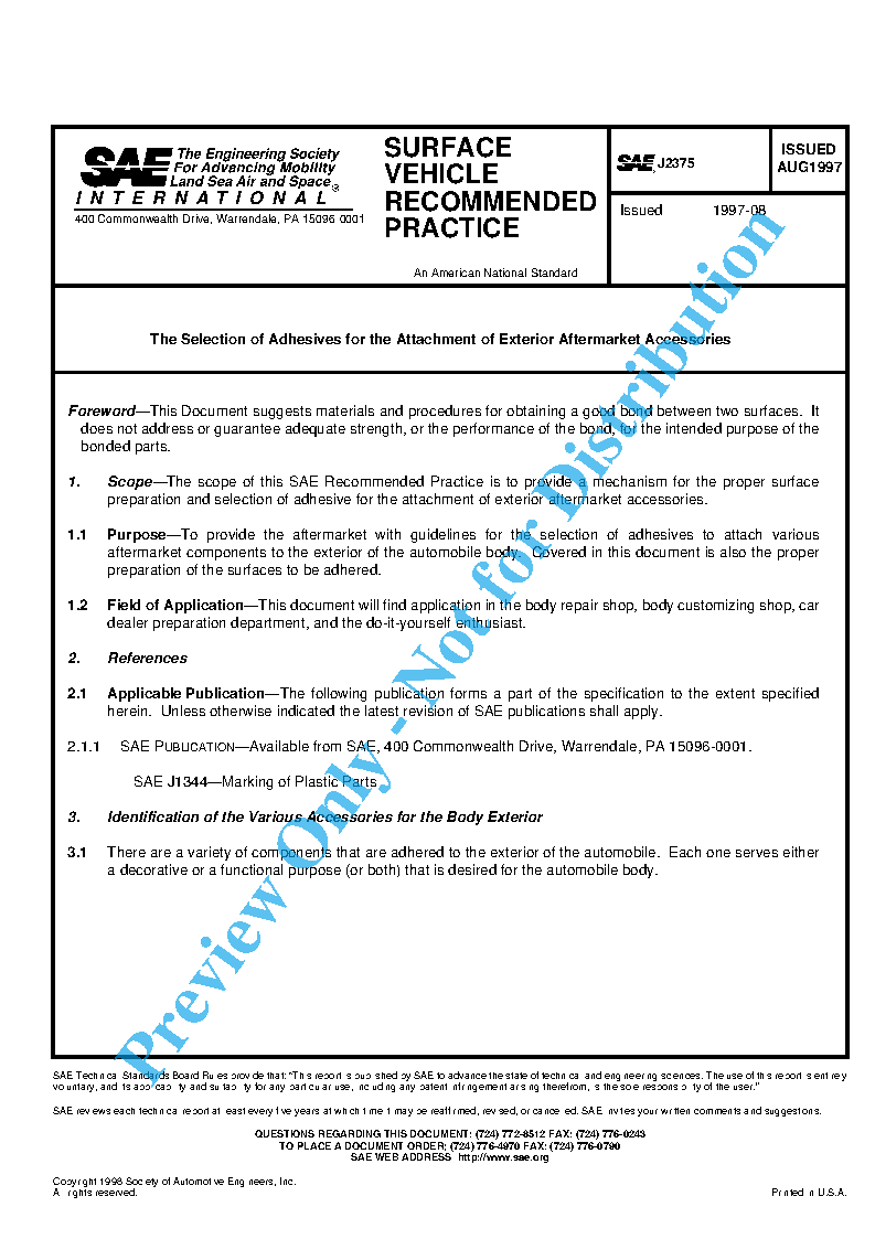 The scope of this SAE Recommended Practice is to provide a mechanism for the proper surface preparation and selection of adhesive for the attachment of exterior aftermarket accessories.