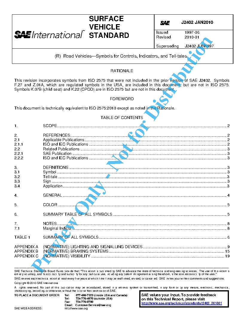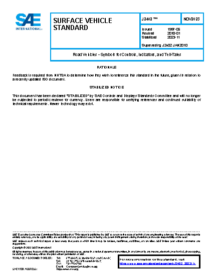 This SAE Standard specifies symbols (i.e. conventional signs) for use on controls, indicators, and tell-tales applying to passenger cars, light and heavy commercial vehicles, and buses, to ensure identification and facilitate use.