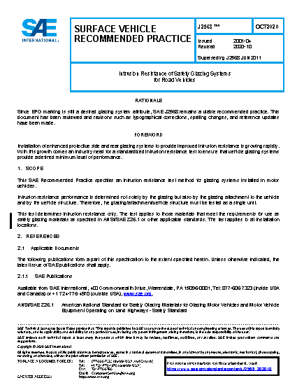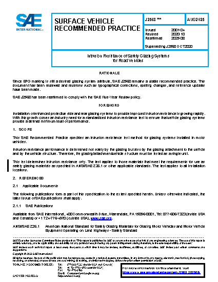 This SAE Recommended Practice specifies an intrusion resistance test method for glazing systems installed in motor vehicles.