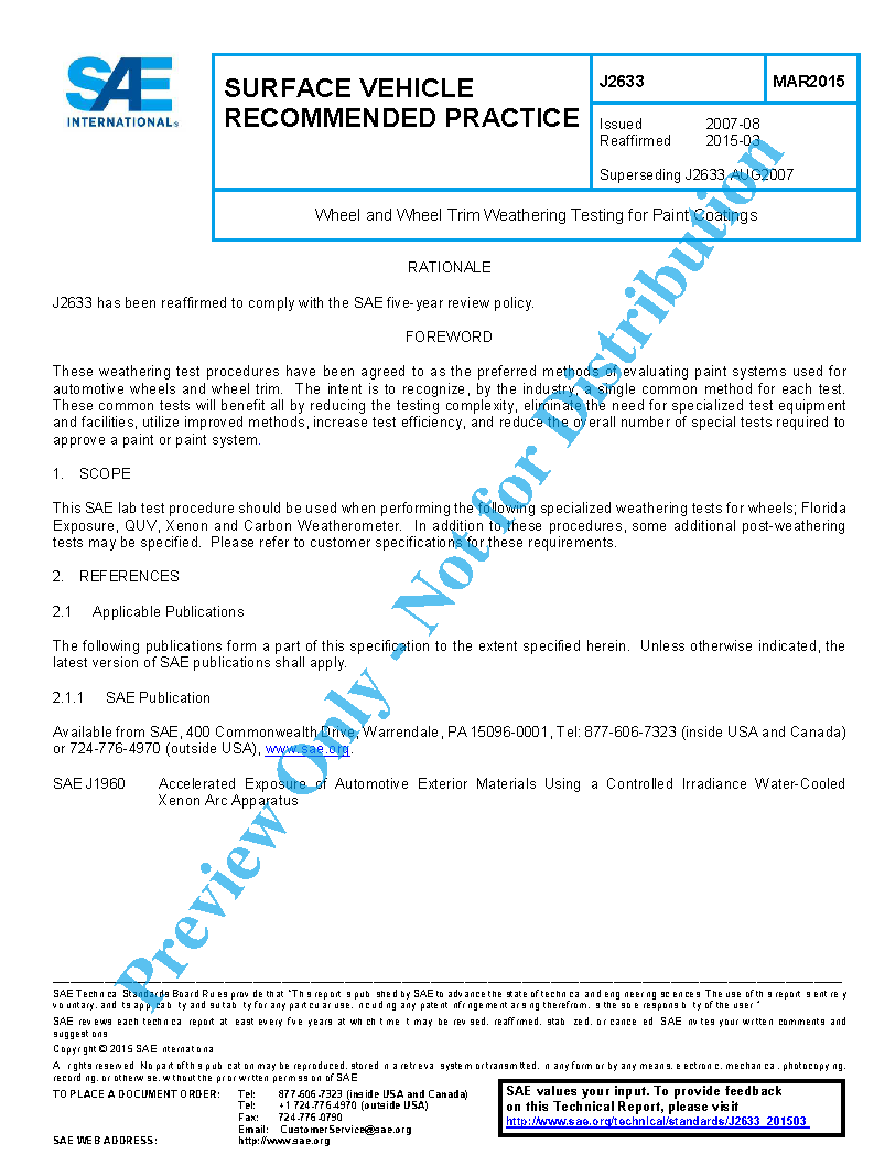 This SAE lab test procedure should be used when performing the following specialized weathering tests for wheels; Florida Exposure, QUV, Xenon and Carbon Weatherometer. In addition to these procedures, some additional post-weathering tests may be specified. Please refer to customer specifications for these requirements.