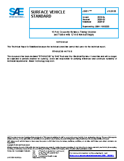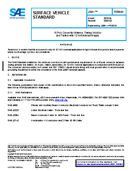 This SAE standard establishes the minimum construction and performance requirements for a 15 Pole Connector Between Towing Vehicles and Trailers, for trucks, trailers, and dollies in conjunction with SAE J2742. The connector accommodates both power and ISO 11992-1 signal circuits along with dual ground wires to accommodate grounding requirements within the constraints of the SAE J2691 terminal capacity.