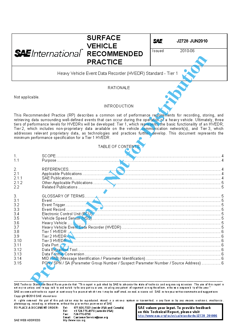 This Recommended Practice (RP) document applies to Heavy Vehicle Event Data Recorders (HVEDR) for heavy-duty (HD) ground wheeled vehicles over 4545 kg (10 000 US pounds), commonly referred to as Class 3–8, which are intended to be compliant with current Federal Motor Vehicle Safety Standards (FMVSS) and/or Federal Motor Carrier Safety Regulations (FMCSR). In the context of the J2728 RP, the term heavy vehicle refers to motor vehicles equipped with one or both of the following vehicle communication networks: SAE J1708/J1587 or SAE J1939. This document is focused primarily on wheeled vehicles with standard on-board power supplies (e.g., batteries). It is intended to address the needs of OEM original, OEM modified/additive, and aftermarket systems. It does not specifically exclude trailers and similar non-engine powered vehicles, even though the current lack of standardized methodologies and processes for inter-vehicular communication and power supply interconnections remain unresolved.