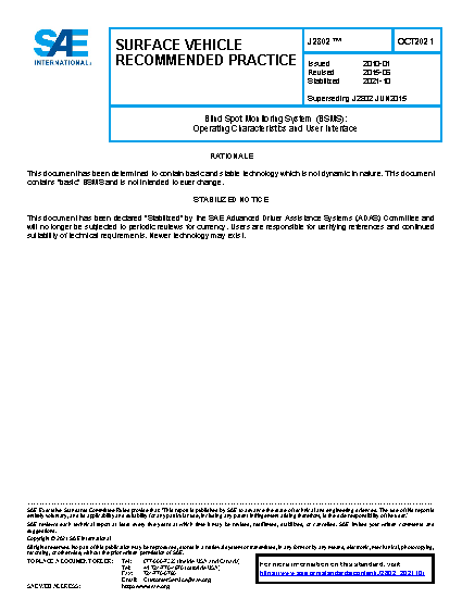 This document applies to original equipment and aftermarket BSMS systems for passenger vehicles. This document does not apply to installing a BSMS on either motorcycles or commercial vehicles. Finally, this document does not address Lane Change Warning systems, which monitor areas substantially farther back than the side blind spot areas monitored by the BSMS (See ISO FDIS 17387).