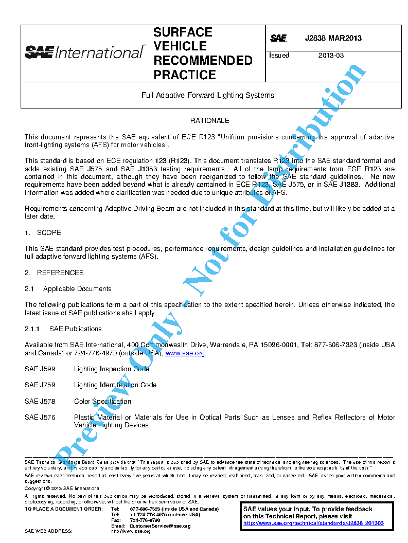 This SAE standard provides test procedures, performance requirements, design guidelines and installation guidelines for full adaptive forward lighting systems (AFS).