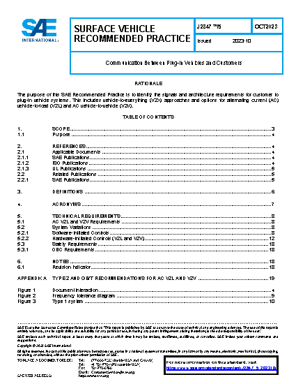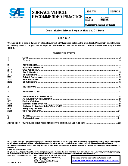SAE has published multiple documents relating to PEV and vehicle-to-grid (V2G) interfaces. The various document series are listed below, with a brief explanation of each.