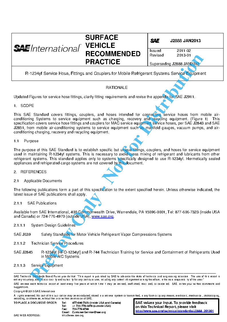 This SAE Standard covers fittings, couplers, and hoses intended for connecting service hoses from mobile air-conditioning Systems to service equipment such as charging, recovery and recycling equipment. (Figure 1) This specification covers service hose fittings and couplers for MAC service equipment service hoses, per SAE J2843 and SAE J2851, from mobile air-conditioning systems to service equipment such as manifold gauges, vacuum pumps, and air-conditioning charging, recovery and recycling equipment.