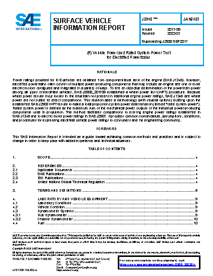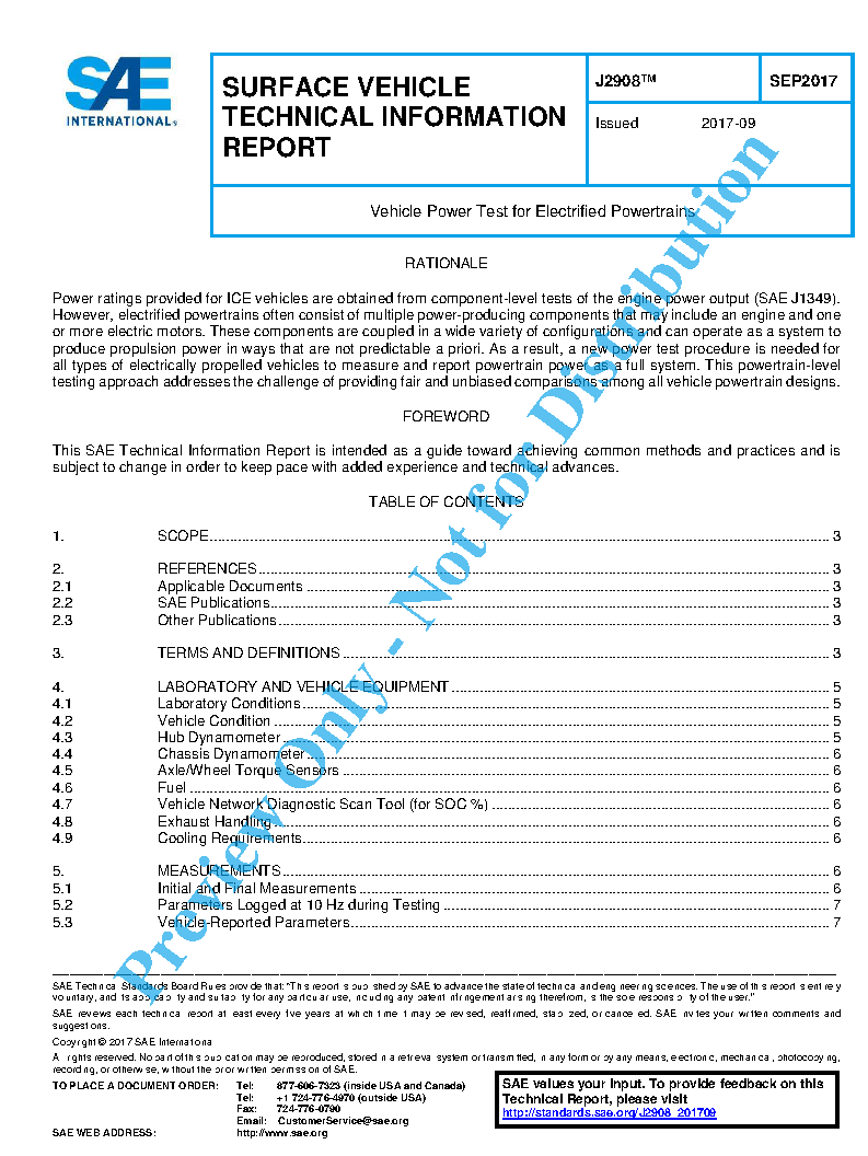 This document provides test methods for evaluating the maximum power of electrified vehicle powertrain systems by direct measurement at the drive wheel hubs or axles. Additional tests are included specifically for PHEVs to measure electric-only propulsion power and for HEVs to measure electric power assist and regenerative braking. The testing requires either a chassis or hub dynamometer for all driven wheels. Results are processed to provide fair and consistent comparisons of power capabilities among different designs of electrified powertrains. Tests can also be performed on conventional vehicles if precise comparisons to electrified vehicles are desired.