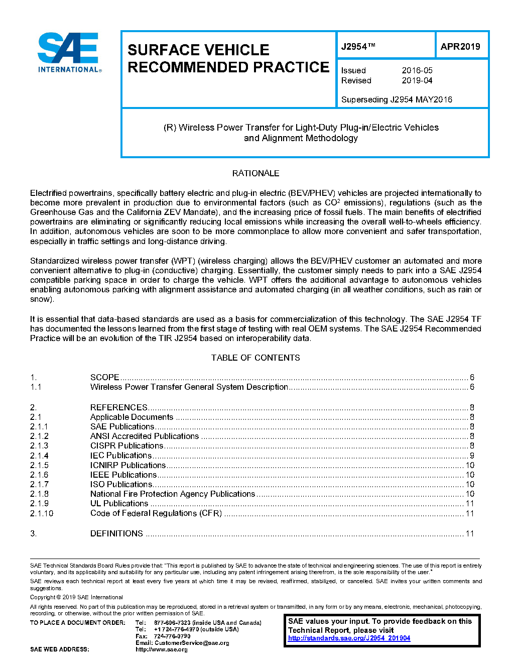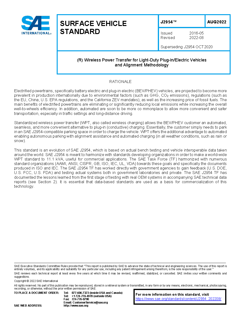 The SAE J2954 standard establishes an industry-wide specification that defines acceptable criteria for interoperability, electromagnetic compatibility, EMF, minimum performance, safety, and testing for wireless power transfer (WPT) of light-duty plug-in electric vehicles. The specification defines three charging levels up to 11 kVA and in future revisions up to 22 kVA. A standard for WPT based on these charge levels enables selection of a charging rate based on vehicle requirements, thus allowing for better vehicle packaging and ease of customer use. This is meant to be used in conjunction with communications standard SAE J2847/6 and use cases J2836/6 and ground assembly WPT Certification UL 2750. The specification supports home (private) charging and public wireless charging.