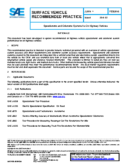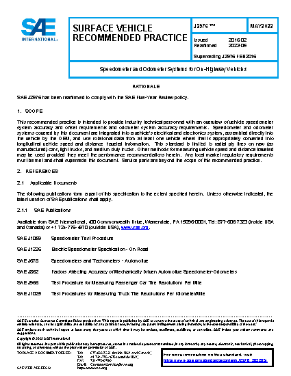 This recommended practice is intended to provide industry technical personnel with an overview of vehicle speedometer system accuracy and offset requirements and odometer system accuracy requirements. Speedometer and odometer systems covered by this document are integrated into a vehicle's electrical and electronics system, assembled directly into the vehicle by the OEM, and use rotational data from at least one vehicle wheel that is appropriately converted into longitudinal vehicle speed and distance traveled information. This standard is limited to radial ply tires on new (as manufactured) cars, light trucks, and medium duty trucks. Other methods for measuring vehicle speed and distance traveled may be used provided they meet the performance recommendations herein. Any local market regulatory requirements must be met and shall supersede this document. Service parts are beyond the scope of this recommended practice.