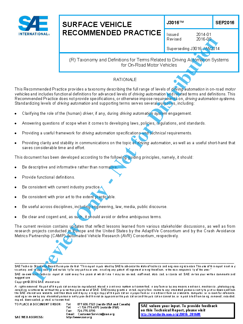 This document describes [motor] vehicle driving automation systems that perform part or all of the dynamic driving task (DDT) on a sustained basis. It provides a taxonomy with detailed definitions for six levels of driving automation, ranging from no driving automation (Level 0) to full driving automation (Level 5), in the context of [motor] vehicles (hereafter also referred to as “vehicle” or “vehicles”) and their operation on roadways: