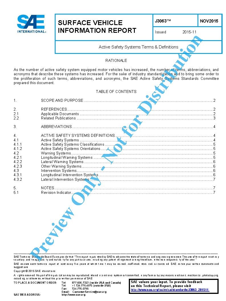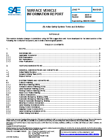 This SAE Technical Information Report provides a compendium of terms, definitions, abbreviations, and acronyms to enable common terminology for use in engineering reports, diagnostic tools, and publications related to active safety systems. This information report is a survey of active safety systems and related terms. The definitions offered are descriptions of functionality rather than technical specifications. Included are warning and momentary intervention systems, which do not automate any part of the dynamic driving task (DDT) on a sustained basis (SAE Level 0 as defined in SAE J3016), as well as definitions of select features that perform part of the DDT on a sustained basis (SAE Level 1 and 2).