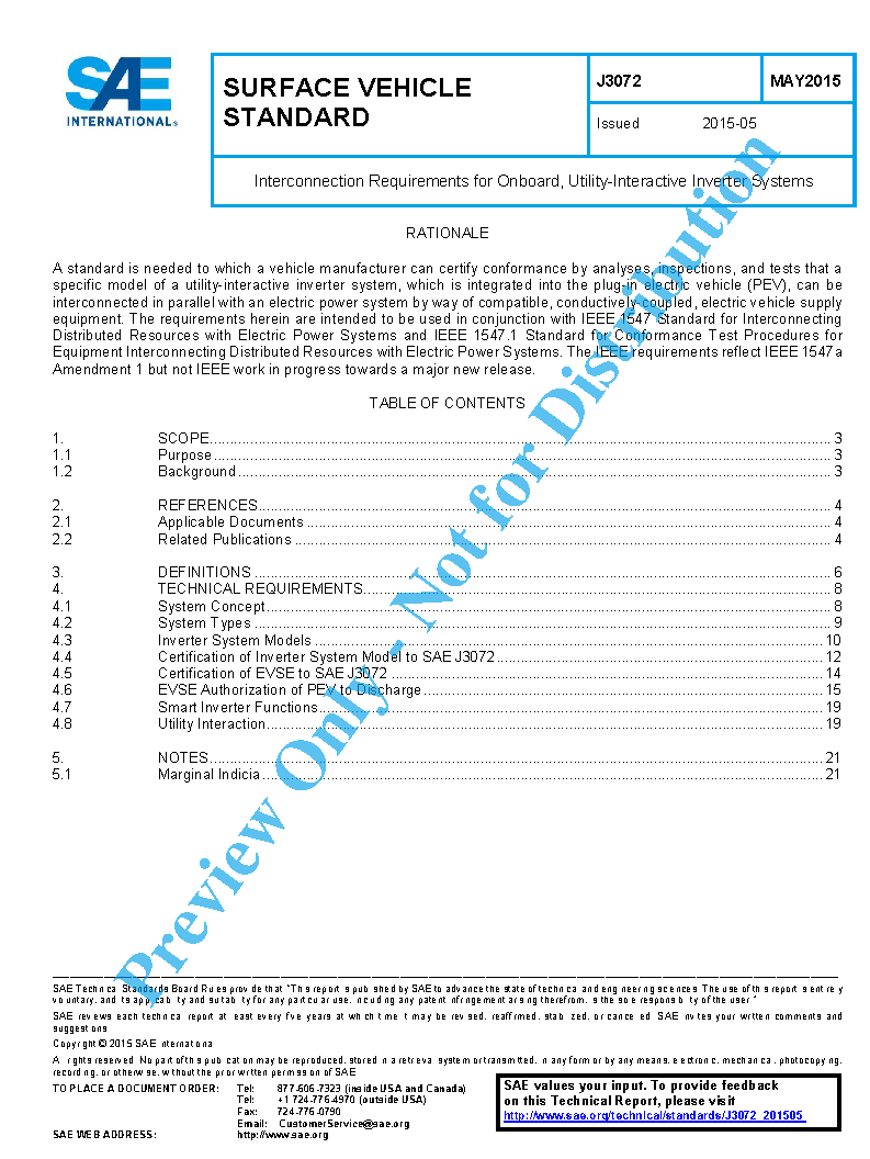 This SAE Standard J3072 establishes interconnection requirements for a utility-interactive inverter system which is integrated into a plug-in electric vehicle (PEV) and connects in parallel with an electric power system (EPS) by way of conductively-coupled, electric vehicle supply equipment (EVSE). This standard also defines the communication between the PEV and the EVSE required for the PEV onboard inverter to be configured and authorized by the EVSE for discharging at a site. The requirements herein are intended to be used in conjunction with IEEE 1547 Standard for Interconnecting Distributed Resources with Electric Power Systems and IEEE 1547.1 Standard for Conformance Test Procedures for Equipment Interconnecting Distributed Resources with Electric Power Systems.