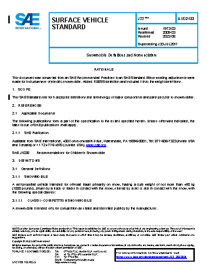 This SAE Recommended Practice sets forth accepted definitions and terminology of major components and parts peculiar to snowmobiles.