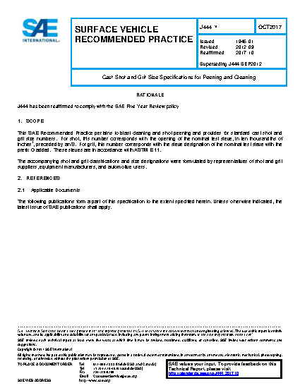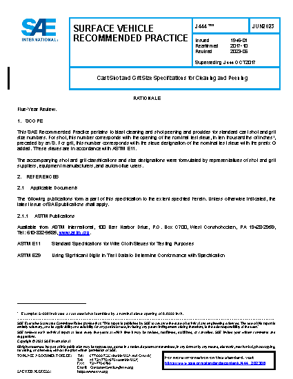 This SAE Recommended Practice pertains to blast cleaning and shot peening and provides for standard cast shot and grit size numbers. For shot, this number corresponds with the opening of the nominal test sieve, in ten thousandths of inches 1 , preceded by an S. For grit, this number corresponds with the sieve designation of the nominal test sieve with the prefix G added. These sieves are in accordance with ASTM E 11.