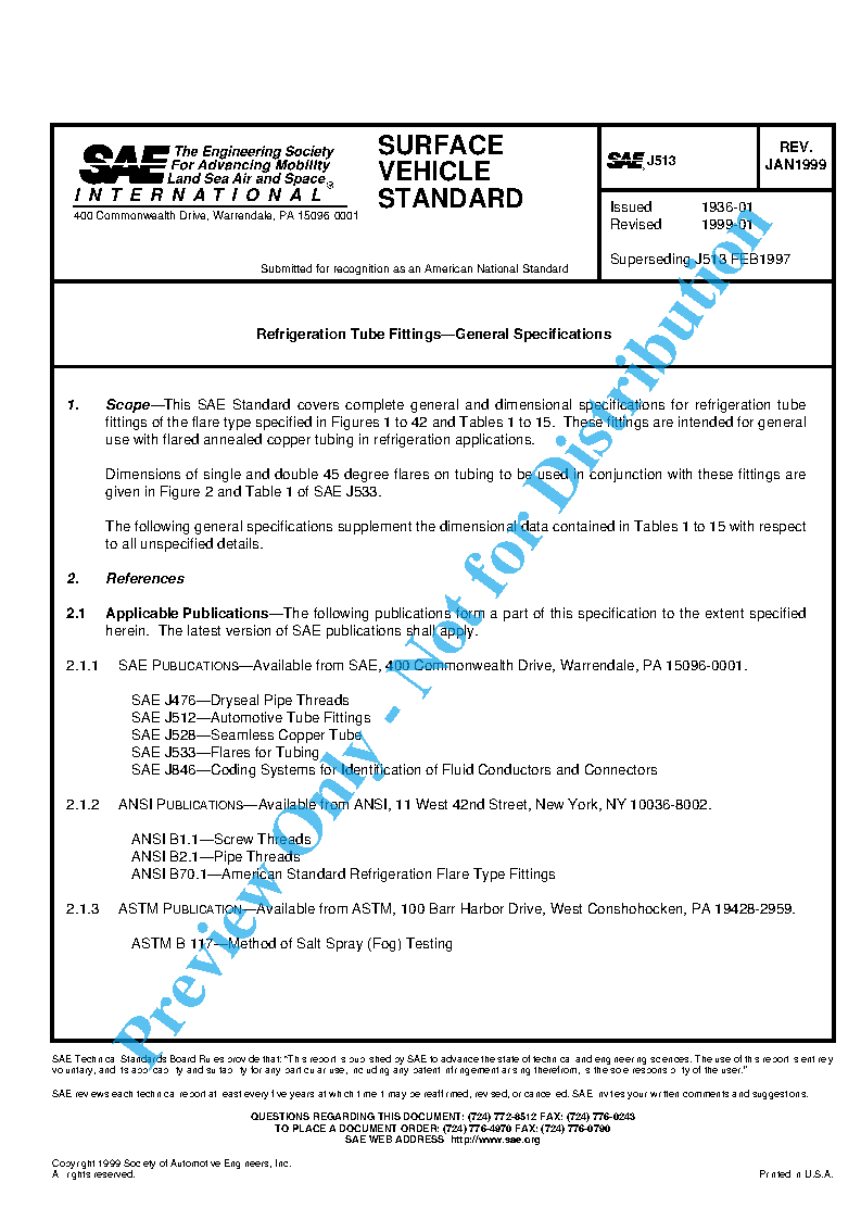 This SAE Standard covers complete general and dimensional specifications for refrigeration tube fittings of the flare type specified in Figures 1 to 42 and Tables 1 to 15. These fittings are intended for general use with flared annealed copper tubing in refrigeration applications.