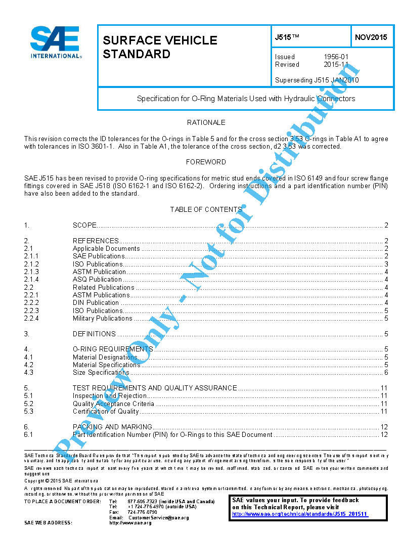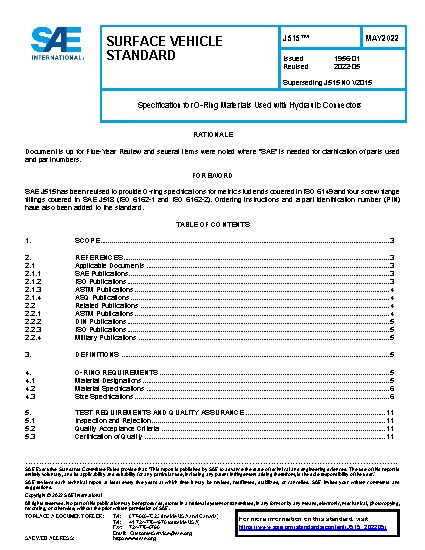 SAE J515 covers the specification for hydraulic O-ring material and properties and sizes applicable to face seal fittings, metric and inch stud ends, and four-bolt flange fittings. The standard includes a size code to allow industry and government agencies to order O-ring with a coded part number.