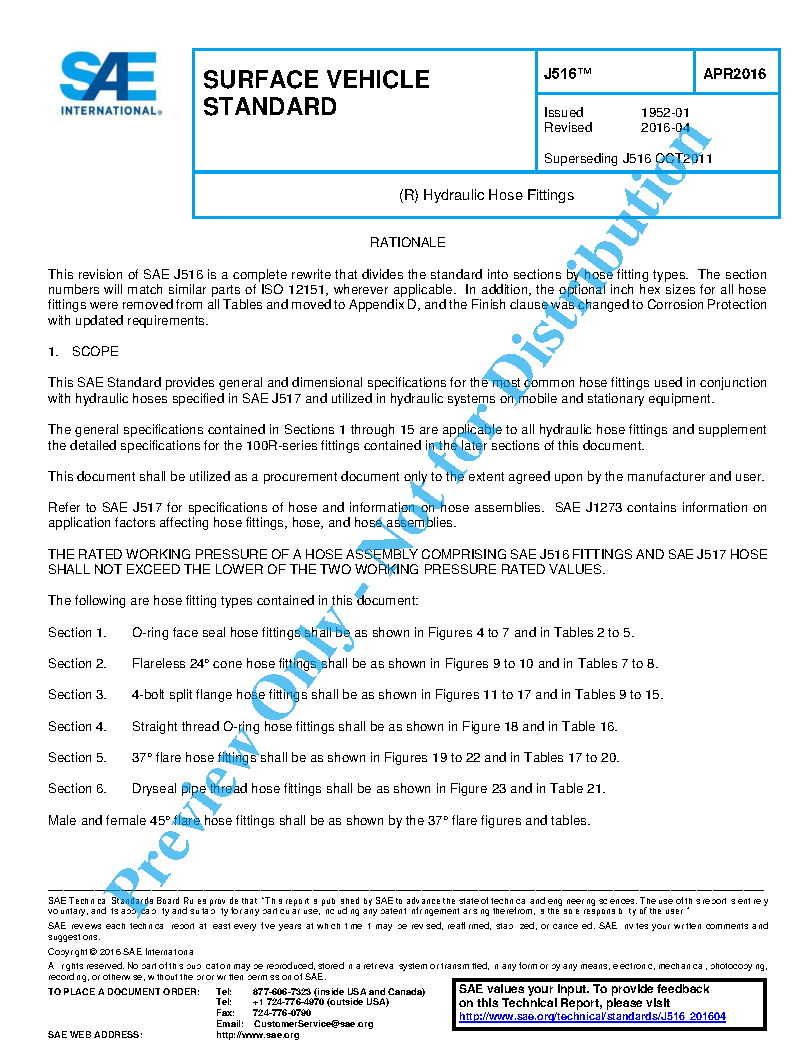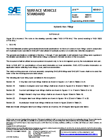 This SAE Standard provides general and dimensional specifications for the most common hose fittings used in conjunction with hydraulic hoses specified in SAE J517 and utilized in hydraulic systems on mobile and stationary equipment.