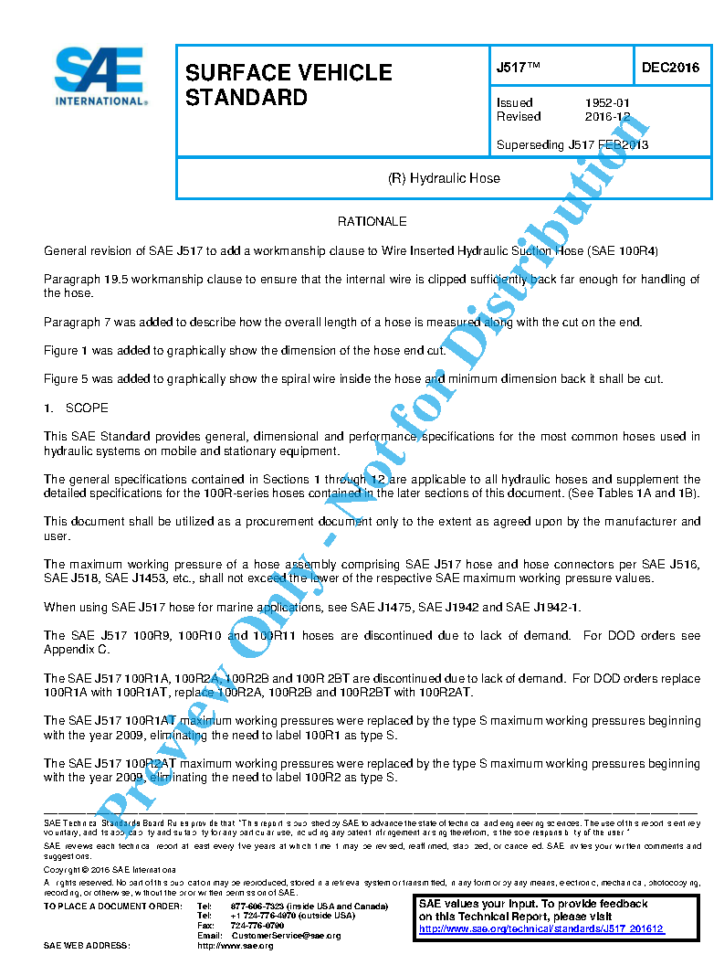 This SAE Standard provides general, dimensional and performance specifications for the most common hoses used in hydraulic systems on mobile and stationary equipment.