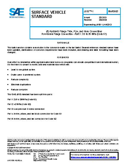 This SAE Standard covers general and dimensional specifications for the Code 61 metric (type 1) and inch (type 2) flanged heads, flange clamps (FC & FCM), and split flange clamps (FCS & FCSM) applicable to four-screw flange type tube, pipe, and hose connections. Also, included are the recommended port dimensions and port design considerations. Type 2 (inch) flange clamps and split flanges are not for new design.