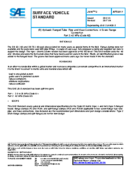 This SAE Standard covers general and dimensional specifications for the Code 62 metric (type 1) and inch (type 2) flanged heads, flange clamps (FC and FCM), and split flange clamps (FCS and FCSM) applicable to four-screw flange type tube, pipe, and hose connections. Also included are the recommended port dimensions and port design considerations. Type 2 (inch) flange clamps and split flanges are not for new design.