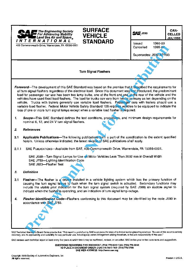 This SAE Standard defines the test conditions, procedures, and minimum design requirements for nominal 6, 12, and 24 V turn signal flashers. Document cancelled in 1999. Information now contained in J1690