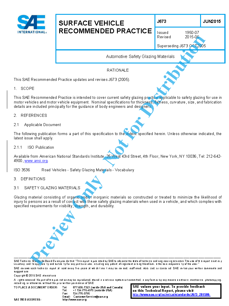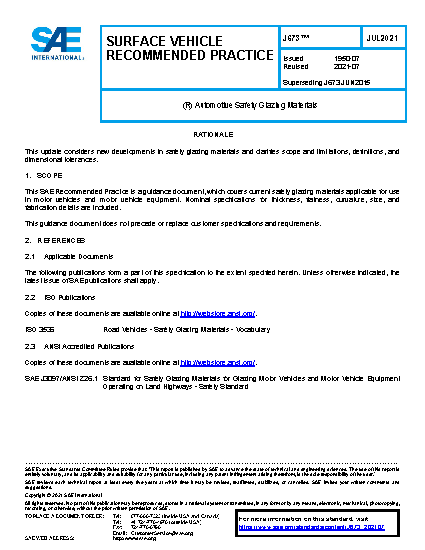 This SAE Recommended Practice is intended to cover current safety glazing practice applicable to safety glazing for use in motor vehicles and motor vehicle equipment. Nominal specifications for thickness, flatness, curvature, size, and fabrication details are included principally for the guidance of body engineers and designers.