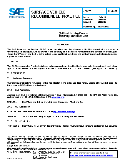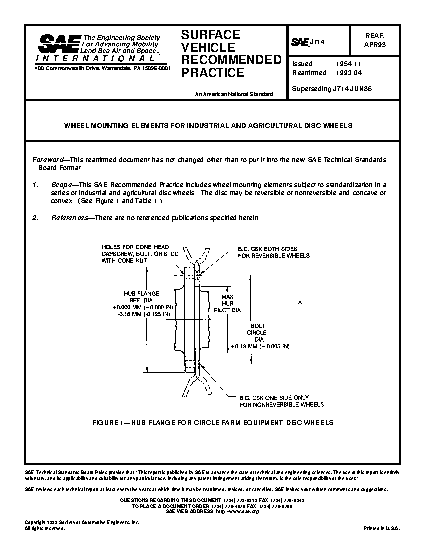 This SAE Recommended Practice includes wheel mounting elements subject to standardization in a series of industrial and agricultural disc wheels. The disc may be reversible or nonreversible and concave or convex. (See Figure 1 and Table 1.)