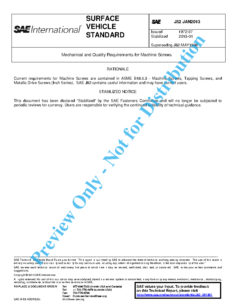 This SAE Standard covers the mechanical and quality requirements for two grades of carbon steel, slotted, and recessed, 82 degrees flat countersunk, 82 degrees oval countersunk, pan, fillister, hex, and hex washer head machine screws in sizes No. 4 through 3/4 in for use automotive and related industries. The dimensions of these screws are covered in ASME B18.6.3.