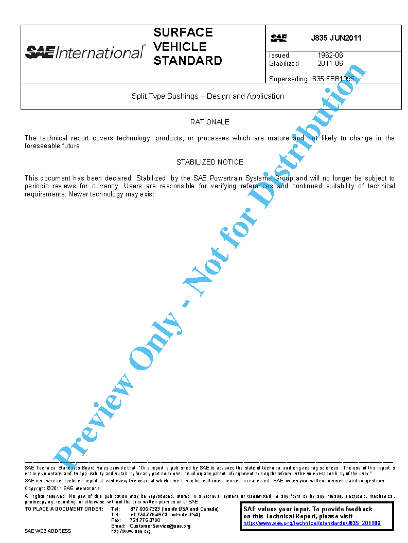 This SAE Standard presents the standard sizes, important dimensions, specialized measurement techniques, and tolerances for split type bushings. Both SI and inch sizes are shown; their dimensions are not exact equivalents. New designs shall use SI units.