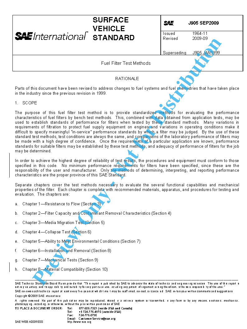 The purpose of this fuel filter test method is to provide standardized methods for evaluating the performance characteristics of fuel filters by bench test methods. This, combined with data obtained from application tests, may be used to establish standards of performance for filters when tested by these standard methods. Many variations in requirements of filtration to protect fuel supply equipment on engines and variations in operating conditions make it difficult to specify meaningful "in-service" performance standards by which a filter may be judged. By the use of these standard test methods, test conditions are always the same, and comparisons of the laboratory performance of filters may be made with a high degree of confidence. Once the requirements of a particular application are known, performance standards for suitable filters may be established by these test methods, and adequacy of performance of filters for the job may be determined.