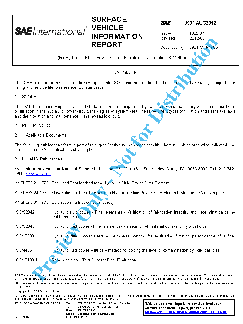 This SAE Information Report is primarily to familiarize the designer of hydraulic powered machinery with the necessity for oil filtration in the hydraulic power circuit, the degree of system cleanliness required, types of filtration and filters available and their location and maintenance in the hydraulic circuit.